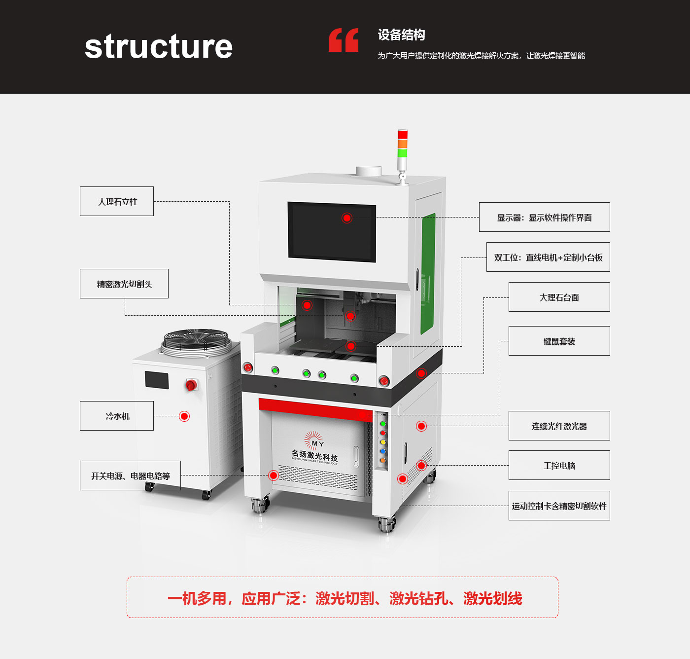 ? 采用高品質(zhì)準(zhǔn)直切割頭,切割效果精良,加裝同軸吹氣系統(tǒng)。